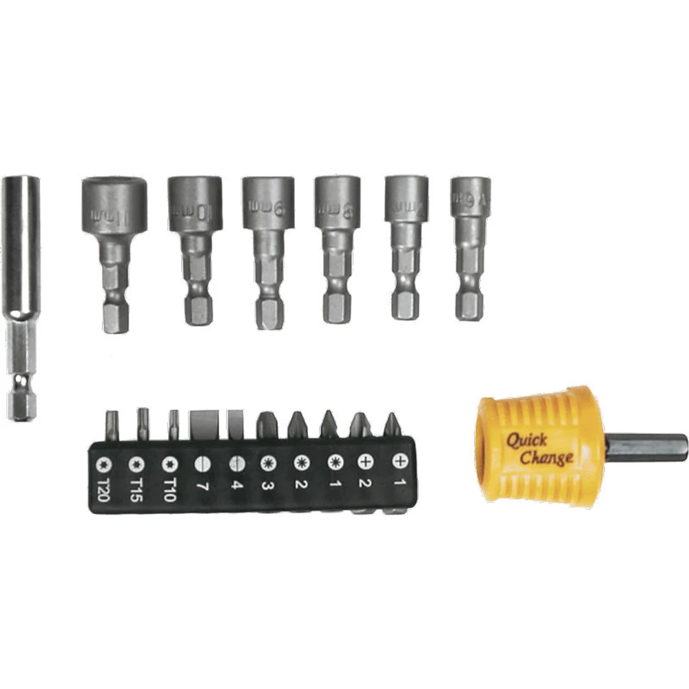Csavarhúzó bitek és dugókulcsok hajtószárral, 18 db-os klt., hajtószár 1/4, 60 mm, 6 db csavarhúzó feltét, méretek: 6 mm, 7 mm, 8 mm, 9 mm, 10 mm, 11 mm, 10 db 25 mm-es csavarhúzó bit, méretek: lapos 4 mm, 7 mm, kereszt PH1, PH2, PZ1, PZ2, PZ3, Torx T10, T15, T20, fel- és lemágnesező, műanyag tok