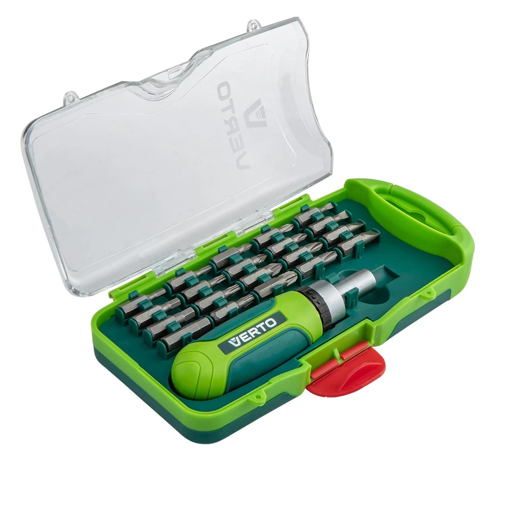 Csavarhúzó bitkészlet VERTO, CrV acél, 21 db-os. Nagyon kényelmes, kompakt csomagolásban. Az ergonómikus bimateriál markolat növeli a használat komfortját. Ideális az összes szerelési munkához. A VERTO márka ajánlata elektromos kéziszerszámokat és tartozékokat tartalmaz az ezermesterek számára.