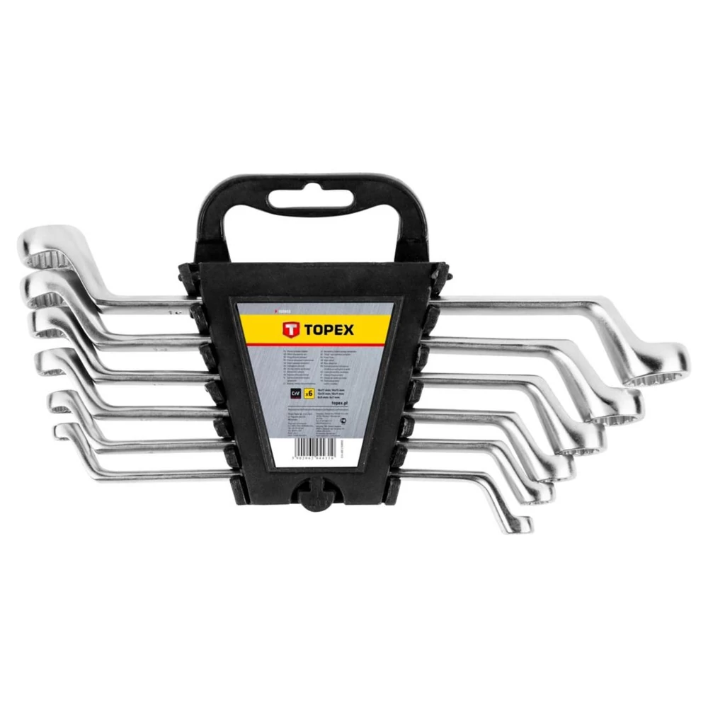 A TOPEX hajlított csillagkulcs készlet kiválóan beválik szerelési, barkácsolási munkákban. A kulcsok mindkét végén a hatlapú csavarok be- és kicsavarására szolgáló csillagkulcs van. Kialakításának köszönhetően lehetővé teszi a mélyedésekben elhelyezett csavarokkal is a munkát. Nagy ellenállóképességű króm-vanádium acélból készültek. Praktikus, a tárolást megkönnyítő műanyag csomagolásban vannak elrendezve. A TOPEX márka ezermestereknek készül.