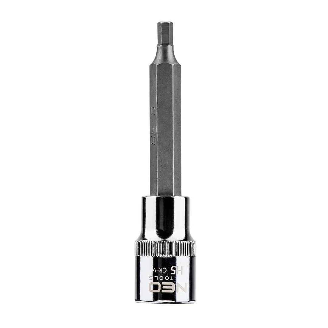 NEO imbusz bit ½”-os fészkű dugófeltéten, 100 mm hosszú, a DIN 7422 szabványnak megfelelő. A dugófeltét nagy ellenállóképességű króm-vanádium acélból készül. A hatlapú bit kiváló minőségű S2 acélötvözetből készül. A szerszám minőségét bizonyítja a TÜV tanúsítvány és a gyártó által nyújtott 25 éves jótállás. A NEO márka a professzionális igényeket is kielégíti.