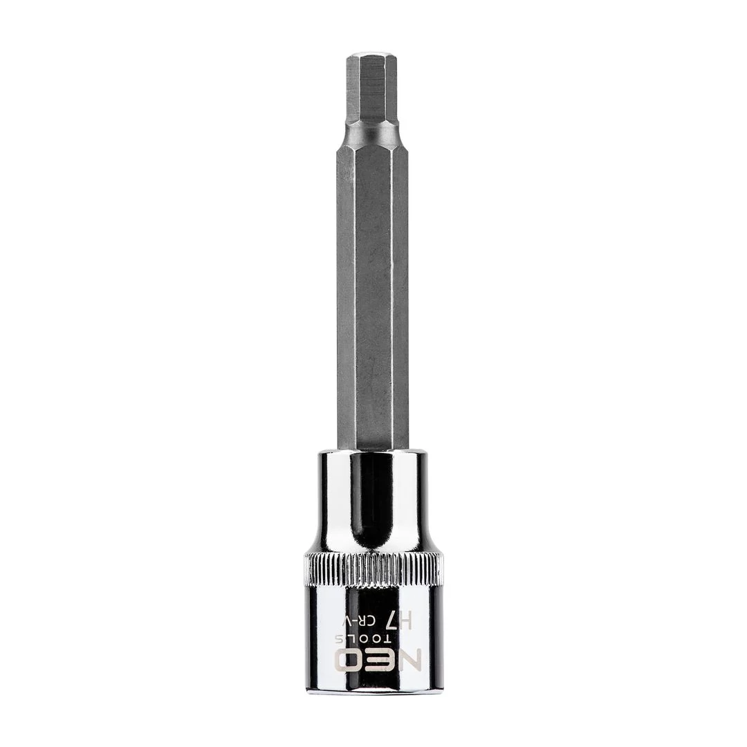 NEO imbusz bit ½”-os fészkű dugófeltéten, 100 mm hosszú, a DIN 7422 szabványnak megfelelő. A dugófeltét nagy ellenállóképességű króm-vanádium acélból készül. A hatlapú bit kiváló minőségű S2 acélötvözetből készül. A szerszám minőségét bizonyítja a TÜV tanúsítvány és a gyártó által nyújtott 25 éves jótállás. A NEO márka a professzionális igényeket is kielégíti.