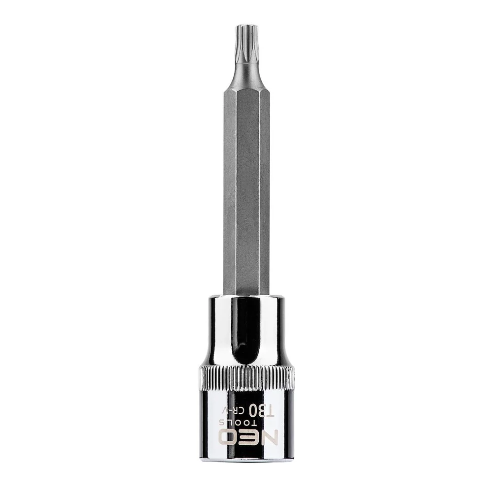 NEO Torx bit ½”-os fészkű dugófeltéten, 100 mm hosszú. A dugófeltét nagy ellenállóképességű króm-vanádium acélból készül. A hatlapú bit kiváló minőségű S2 acélötvözetből készül. A szerszám minőségét bizonyítja a TÜV tanúsítvány és a gyártó által nyújtott 25 éves jótállás. A NEO márka a professzionális igényeket is kielégíti.