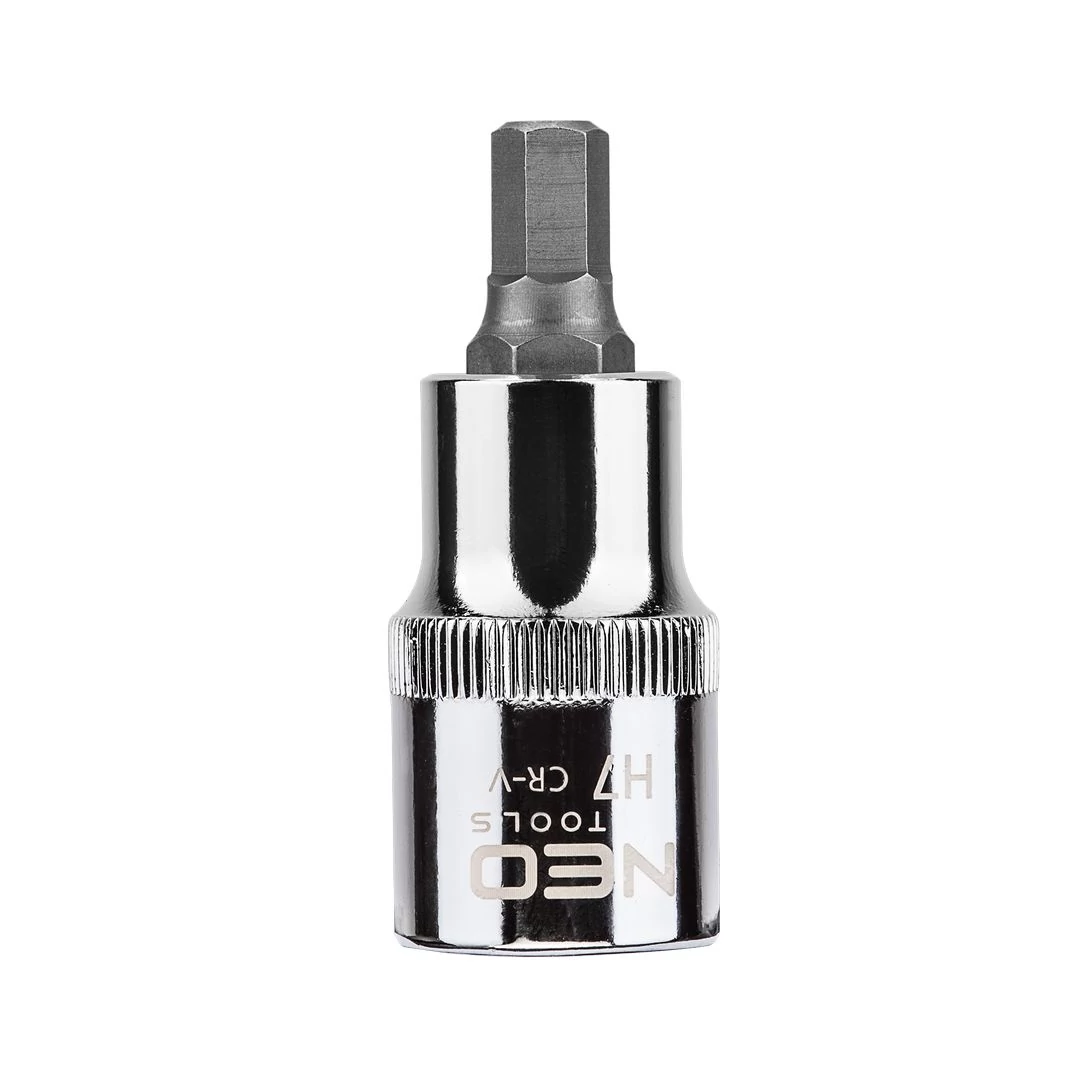 NEO imbusz bit ½”-os fészkű dugófeltéten, 55 mm hosszú, a DIN 7422 szabványnak megfelelő. A dugófeltét nagy ellenállóképességű króm-vanádium acélból készül. A hatlapú bit kiváló minőségű S2 acélötvözetből készül. A szerszám minőségét bizonyítja a TÜV tanúsítvány és a gyártó által nyújtott 25 éves jótállás. A NEO márka a professzionális igényeket is kielégíti.
