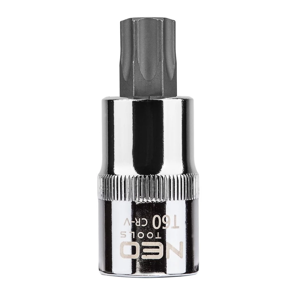 NEO Torx bit ½”-os fészkű dugófeltéten, 55 mm hosszú. A dugófeltét nagy ellenállóképességű króm-vanádium acélból készül. A hatlapú bit kiváló minőségű S2 acélötvözetből készül. A szerszám minőségét bizonyítja a TÜV tanúsítvány és a gyártó által nyújtott 25 éves jótállás. A NEO márka a professzionális igényeket is kielégíti.