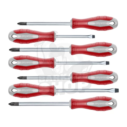FORTUM csavarhúzó klt., 7db; lapos: 3×75, 5×100, 6×125mm, PH1×100, PH2×125, PZ1×100, PZ2×125, CV. mágneses, papír doboz