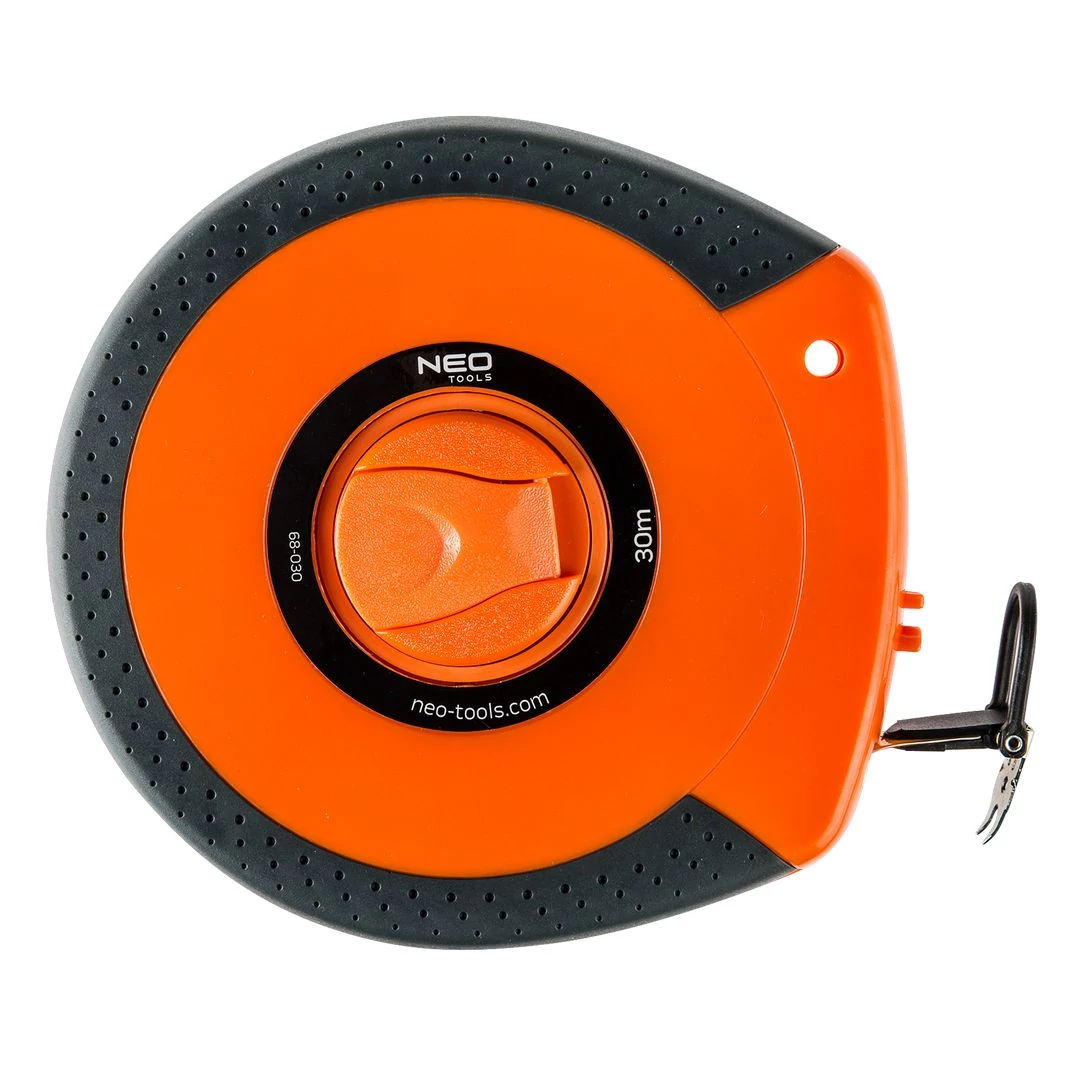 NEO 30 m hosszú mérőszalag (cikkszám: 68-030). Kiváló minőségű üvegszállal erősített szalaggal. Az erős műanyagból készült, csúszásmentes betétekkel ellátott, ergonómikus formájú ház biztos fogást nyújt. A szalagvég védő lehetővé teszi a szalag rögzítését, ami megkönnyíti a mérés elvégzését. A NEO márka a professzionális igényeket is kielégíti.