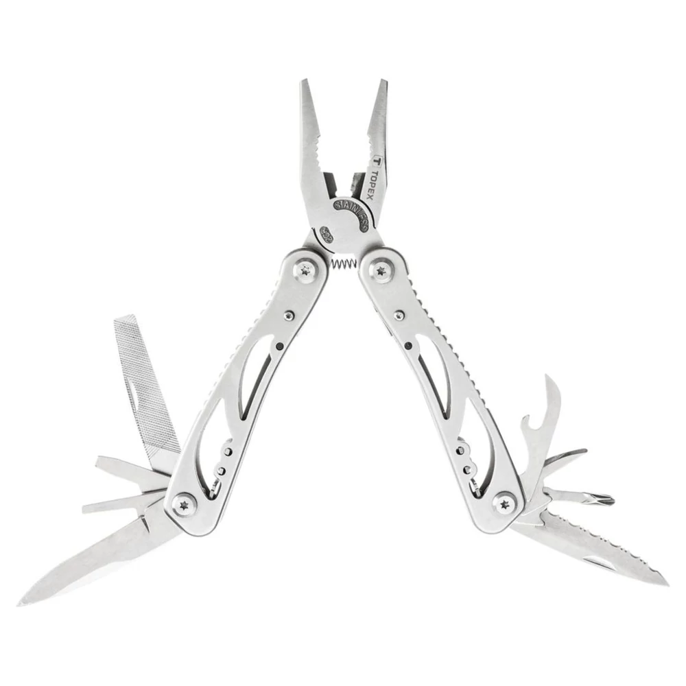 TOPEX multifunkciós szerszám, 165 mm hosszú. A rozsdamentes acél markolat biztosítja a szilárdságot és a korrózióállóságot. Egy szerszámban több különféle funkció van összegyűjtve, pl. a legnépszerűbb PH2 csavarhúzó, a sok helyzetben nélkülözhetetlen éles késpenge, valamint a táborozáskor mindig szükséges doboz- és sörnyitó. A strapabíró poliamid szövet tok megkönnyíti a tárolást és a szállítást A TOPEX márka ezermestereknek készül.