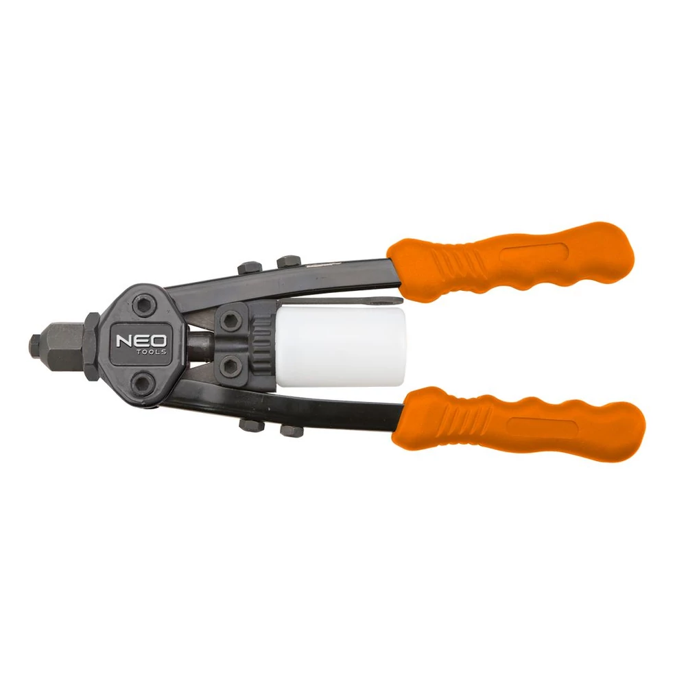 NEO szegecshúzó egyenes állású fejjel acél, rozsdamentes acél, alumínium és réz szegecsekhez. Professzionális felhasználásra az iparban és az építőiparban. Kemény anyagok, pl. acél, rozsdamentes acél szegecseléséhez. A hárompofás befogó erősebb szegecstartást és szegecstüske eltávolítást biztosít. A rövid nyelek és a kis méretek lehetővé teszik a munkát nehezen hozzáférhető helyeken is. A letört szegecstüskékhez beépített tartállyal. A termék kiváló minőségét és megbízhatóságát bizonyítja a TÜV Rheinland tanúsítvány. A NEO márka a professzionális igényeket is kielégíti.