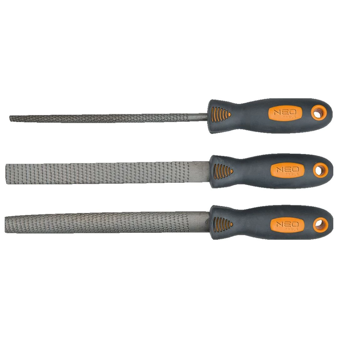 A NEO ráspolykészletben három db 200 mm hosszú ráspoly van, lapos, félkerek és kör keresztmetszettel. Fa csiszolására szolgál. Kiváló minőségű, nagy keménységű T12-es acélötvözetből készül. Az ergonómikus, TPR bevonatú nyél biztosítja a kényelmet és a biztonságot a munkavégzés során. A NEO márka a professzionális igényeket is kielégíti.