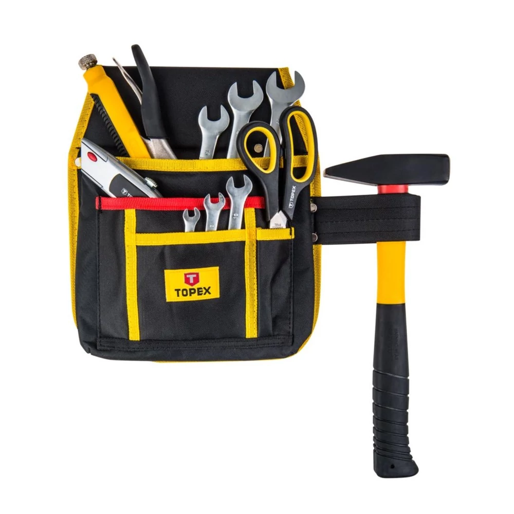 TOPEX strapabíró műanyagból készült szerszámtartó. Fém füllel a kalapács függesztéséhez és 4 zsebbel szerszámoknak. Nadrágszíjra szerelhető. A TOPEX márka ezermestereknek készül.