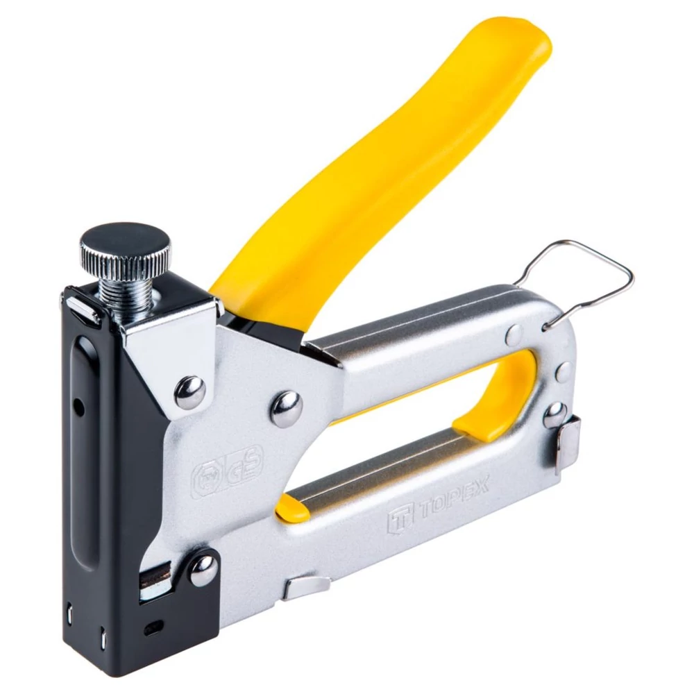 TOPEX kárpitos tűzőgép 6-14 mm méretű J tip. tűzőkapcsokhoz. A fémház garantálja a szerszám tartósságát. Kiválóan beválik kárpitos és dekoratőri munkákban, fóliák és bőrök felerősítésében. A tűzőkapcsok beütési ereje szabályozható, így alkalmazható kemény és puha anyagokhoz is. Precízen üti be a tűzőkapcsokat azok megroggyanása nélkül, még kemény anyagokba is. Az ergonómikus, teherbíró fém markolat a kényelem növelése érdekében műanyag bevonatot kapott. A TOPEX márka ezermestereknek készül.