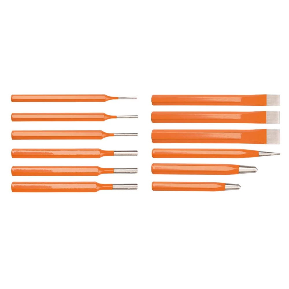 Véső, kiütő és pontozó készlet, 5 db-os, pontozók: 6 mm, 8 mm, kúpos csapszegkiütő: 4 mm, vésők: 10 x 140 mm, 13 x 152 mm, 16 x 170 mm, kiütők: 15 mm, 3 mm, 4 mm, 5 mm, 6 mm i 8 mm, CrV acél